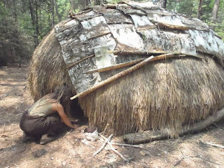 Me--entering a birch bark and marsh grass wigwam at Teaching Drum-June 2013??